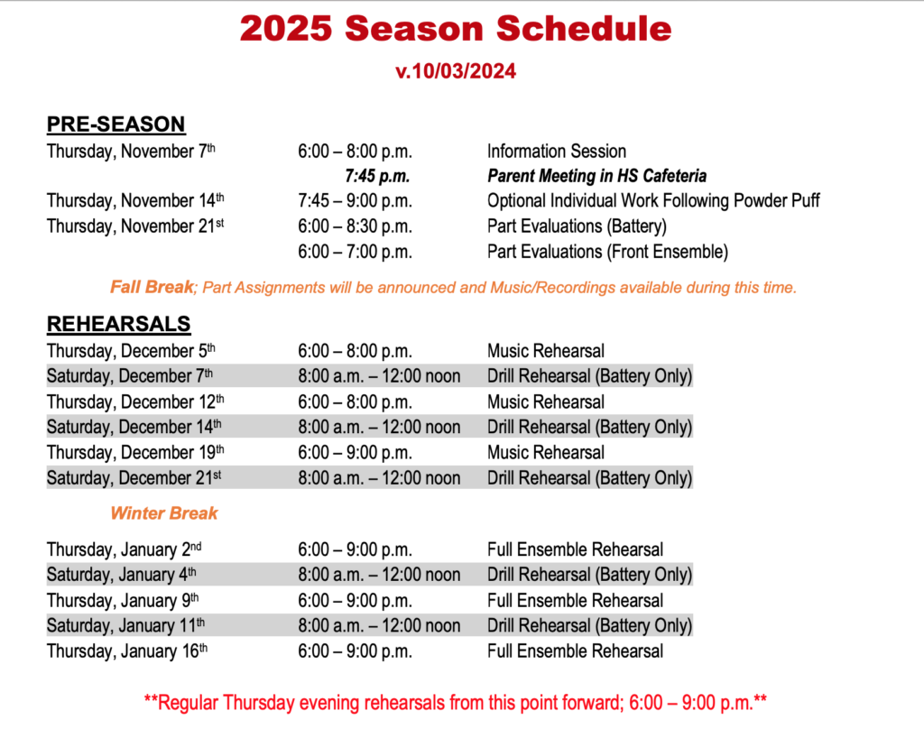 ALL INFORMATION ON THE CURRENT SEASON WILL AVAILABLE IN THE DRUMLINE DROPBOX ONCE THE SEASON BEGINS. PLEASE REFERENCE THAT FOR ALL DETAIL THROUGHOUT THE SEASON.