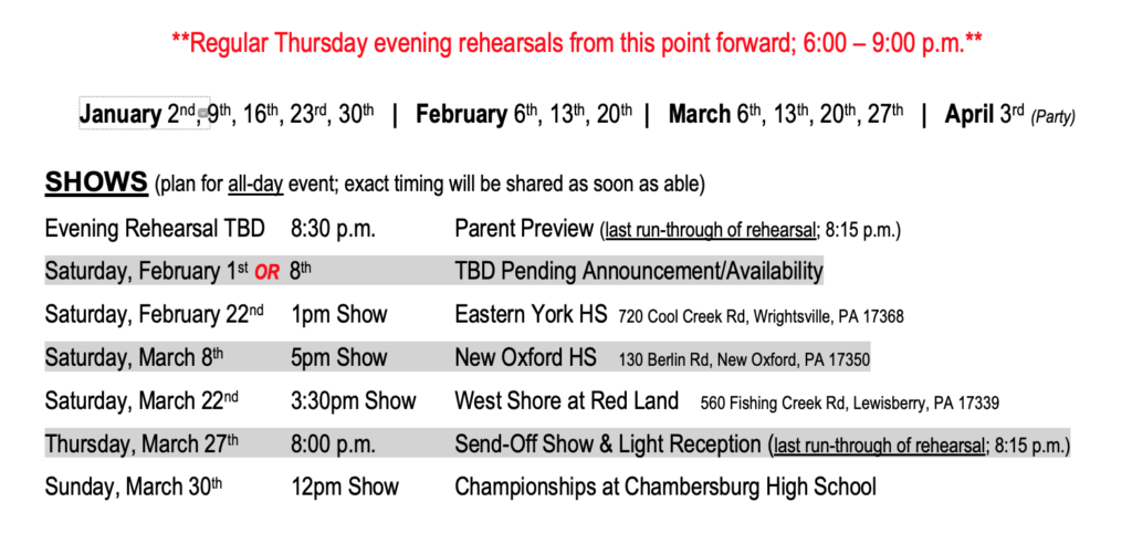 **Please note that inability to attend every date does NOT preclude you from being a member of the ensemble, rather those dates should be communicated prior to auditions.